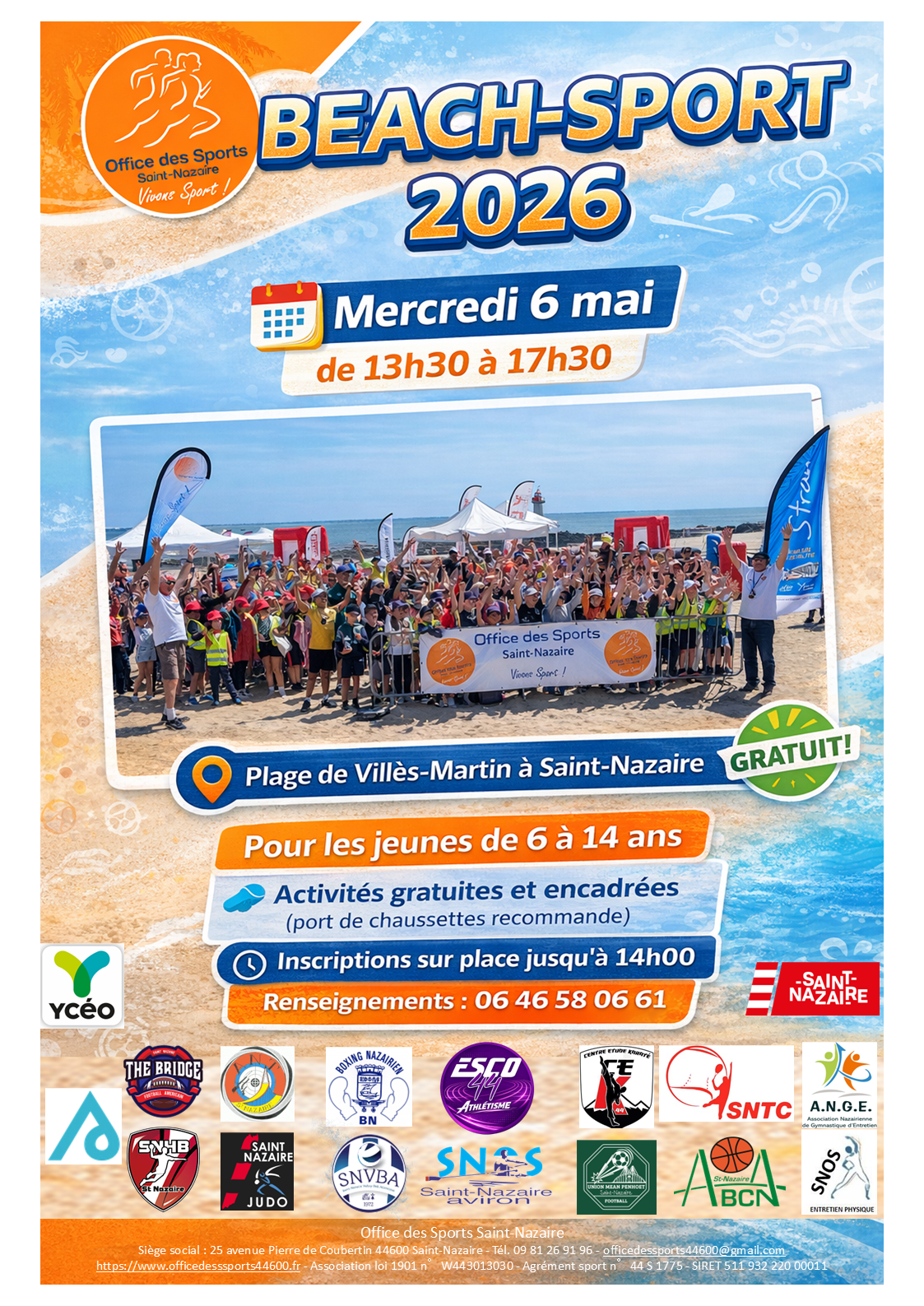 L'Office Des Sports de Saint-Nazaire organisera sur la plage de Villès-Martin, le mercredi 6 mai de 13h30 à 17h30, une animation sportive gratuite pour tous les jeunes de 6 à 14 ans. Lors de cette journée, différents clubs sportifs Nazairiens seront présents pour animer des activités.
